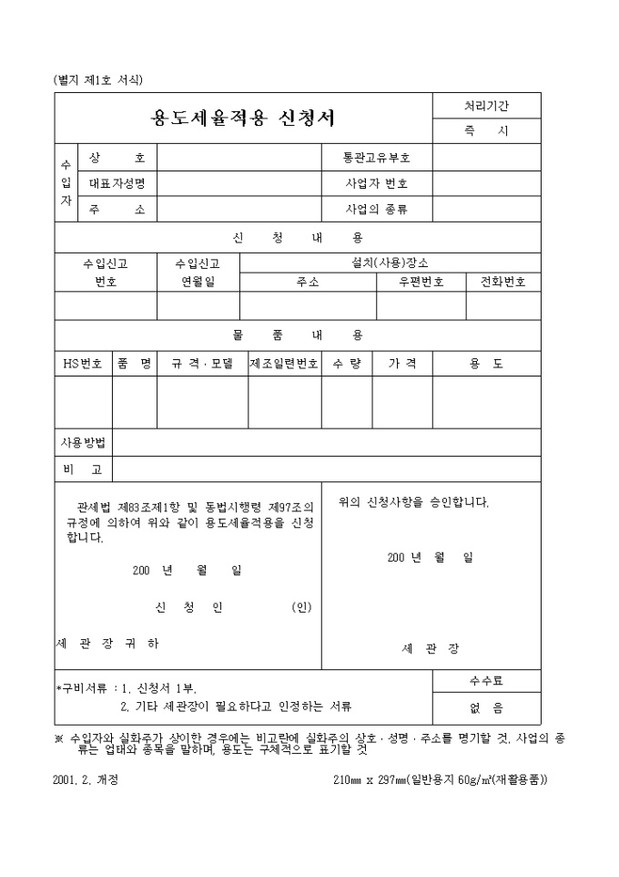 용도세율적용 신청서2001.2