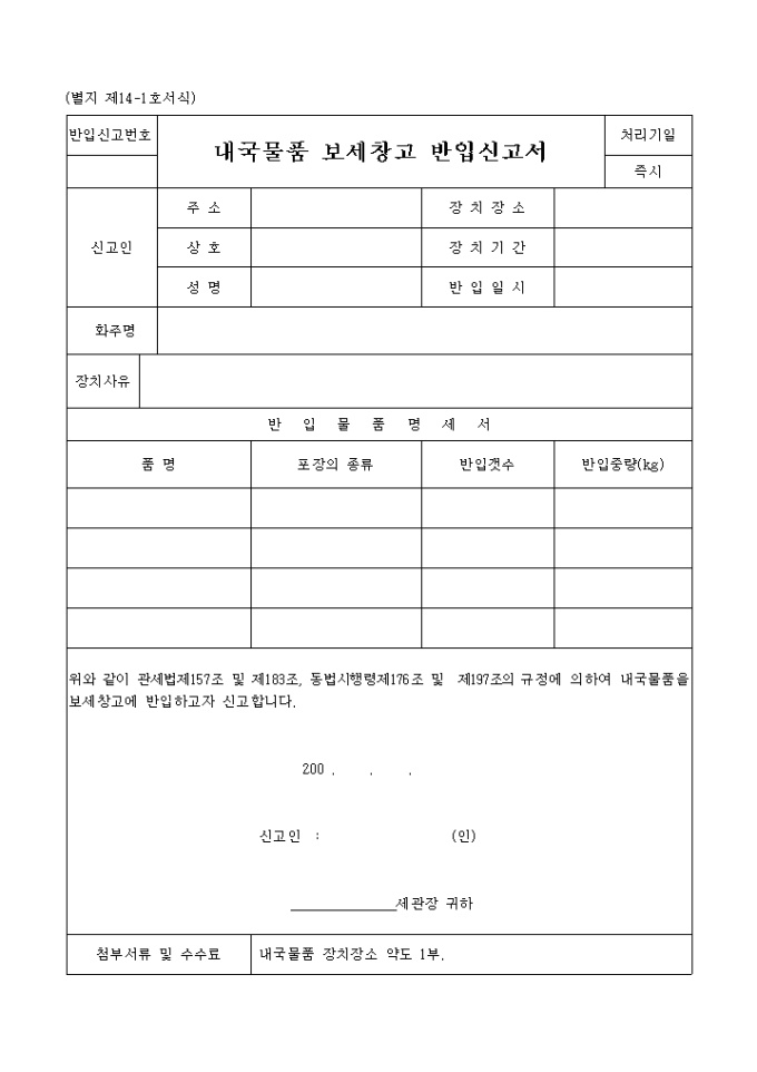 위와 같이 관세법제157조 및 제183조, 동법시행령제176조 및 제197조의 규정에 의하여 내국물품을 보세창고에 반입하고자 신고합니다.