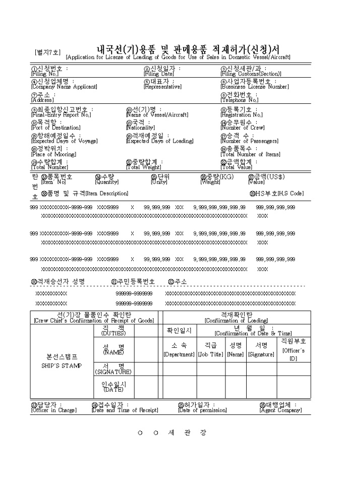 내국선(기)용품 및 판매용품 적재허가(신청)서(2003.2.4등록)