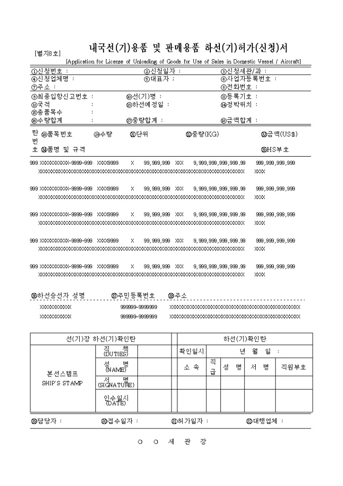 내국선(기)의 용품 및 판매용품을 하선(기) 하기 위해 허가를 득하기 위한 신청/허가 양식입니다.