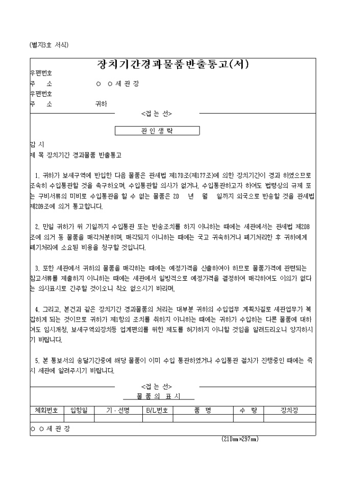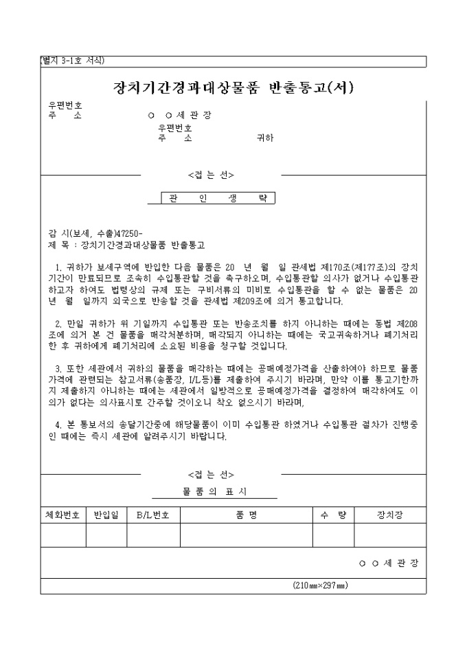 9,000원/월장치기간경과 대상물품 반출통고(서)2003.2.4 양식입니다.