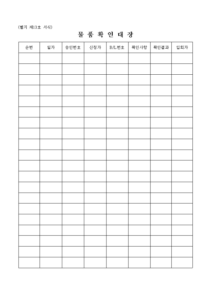 순번, 일자, 승인번호, 신청자, B/L번호, 확인사항, 확인결과, 입화자의 구분으로 나뉘어 구성되어 있습니다.