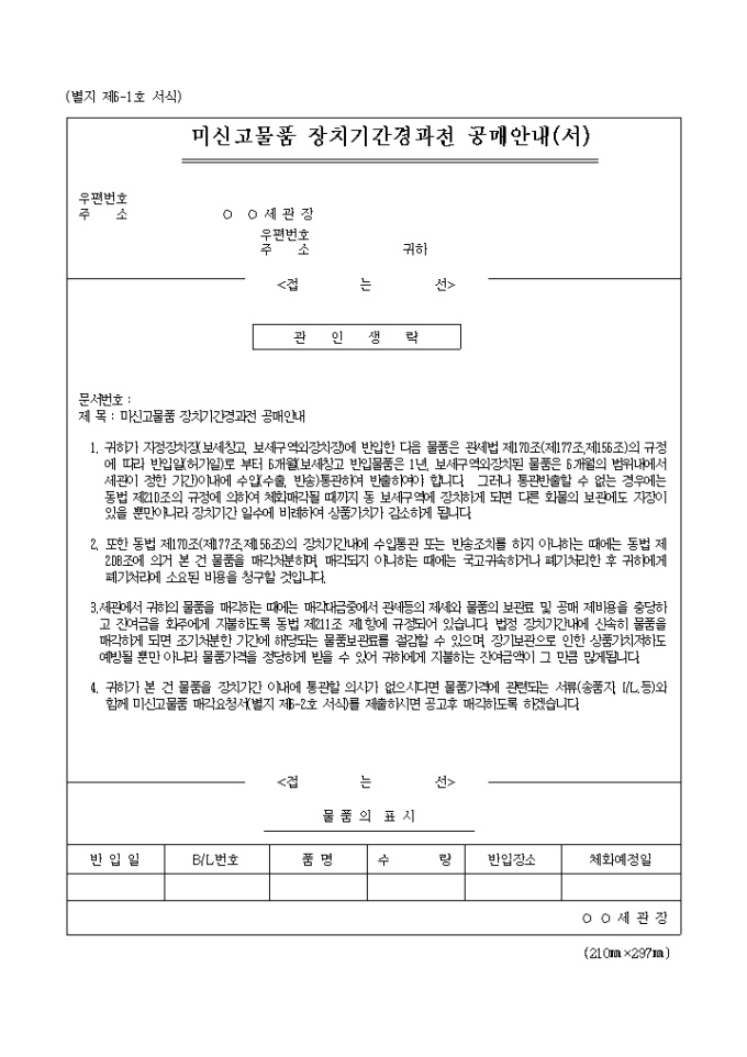 미신고물품 장치기간경과전 공매안내(서)(2003.2.4등록) 서식입니다.