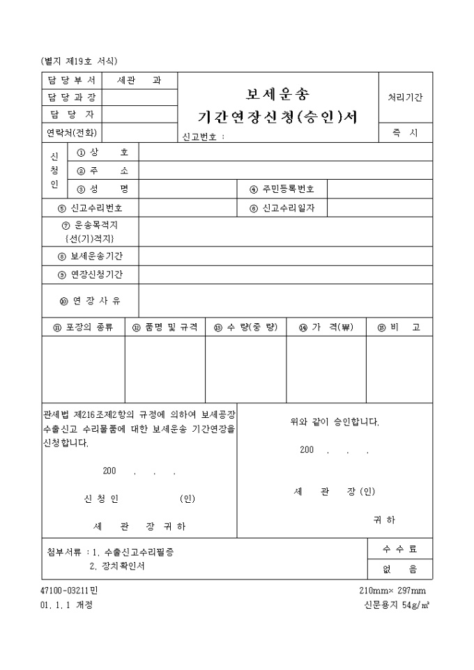 관세법 제216조제2항의 규정에 의하여 보세공장 수출신고 수리물품에 대한 보세운송 기간연장을 신청합니다.