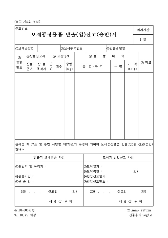관세법 제157조 및 동법 시행령 제176조의 규정에 의하여 보세공장물품 반출(입)을 신고(승인)합니다.