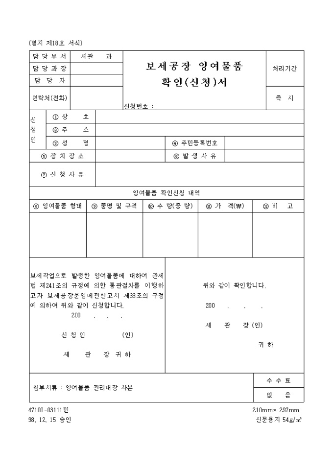 보세공장 잉여물품 확인(신청)서(1998.12.15승인) 양식입니다. 보세작업으로 발생한 잉여물품에 대하여 관세법 제241조의 규정에 의한 통관절차를 이행하고자 보세공장운영에관한고시 제33조의 규정에 의하여 위와 같이 신청합니다.