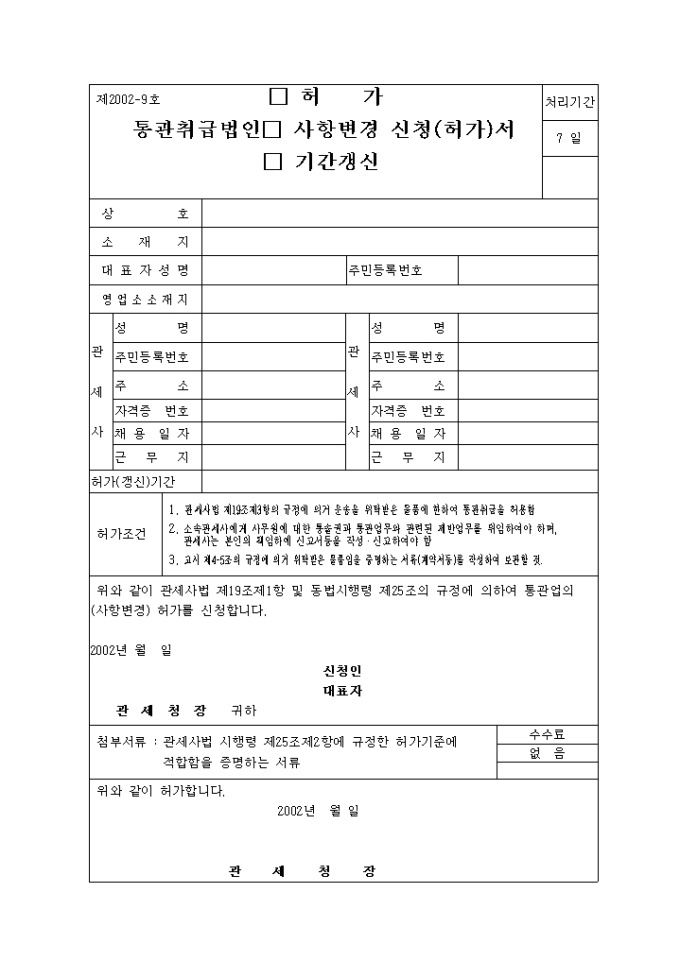 9,000원/월통관취급법인 (허가, 사항변경, 기간갱신) 신청(허가)서2003.2.4 서식입니다.