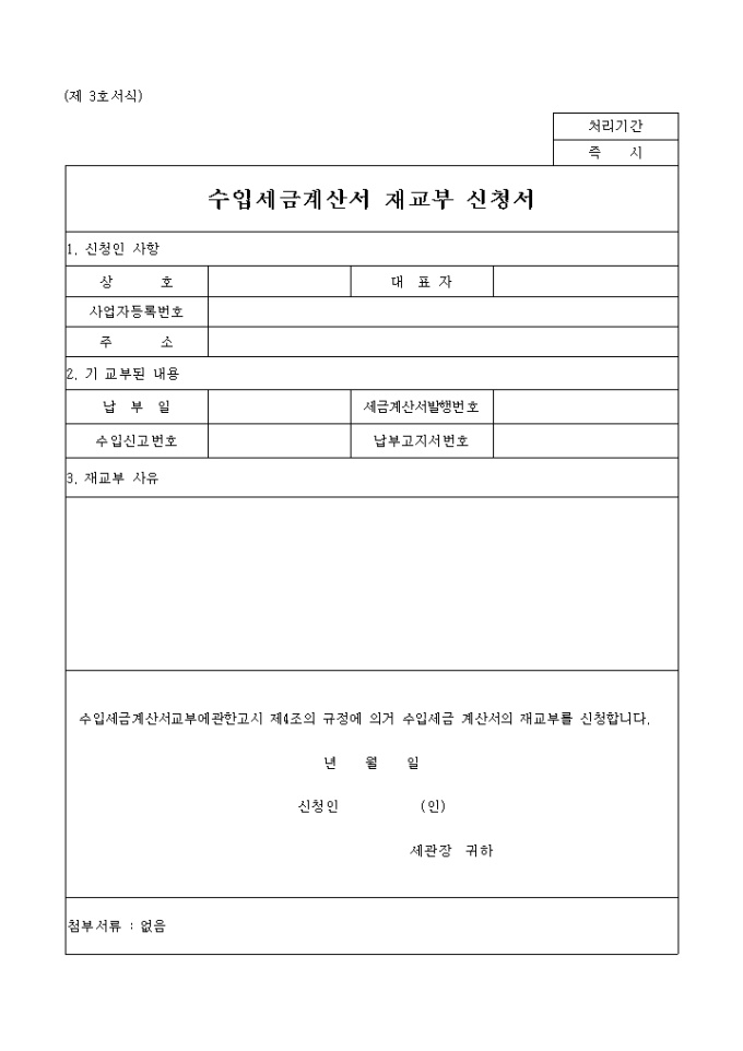 수입세금계산서교부에관한고시 제4조의 규정에 의거 수입세금 계산서의 재교부를 신청합니다.