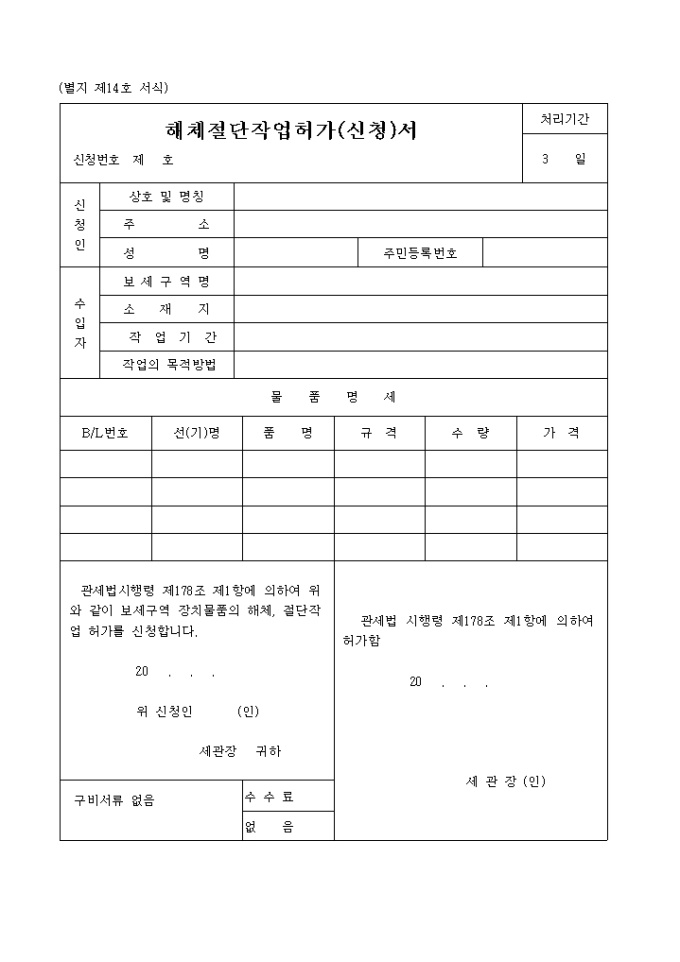 관세법시행령 제178조 제1항에 의하여 위와 같이 보세구역 장치물품의 해체, 절단작업 허가를 신청합니다.