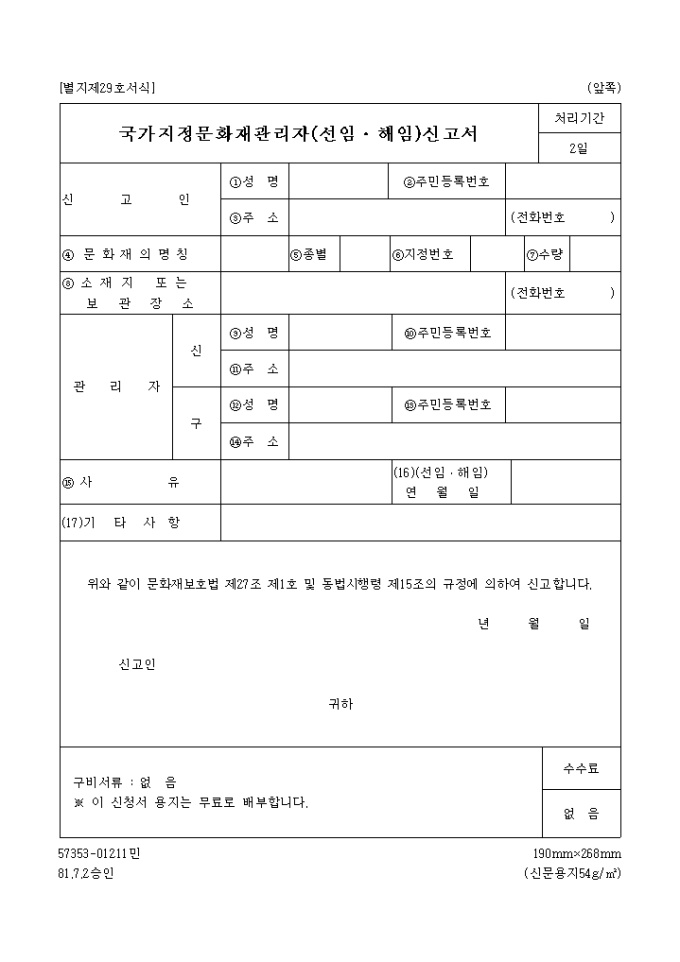 9,000원/월위와 같이 문화재보호법 제27조 제1호 및 동법시행령 제15조의 규정에 의하여 신고하고자 할 때 사용하는 "국가 지정 문화재 관리자(선임,해임)신고서" 양식입니다.