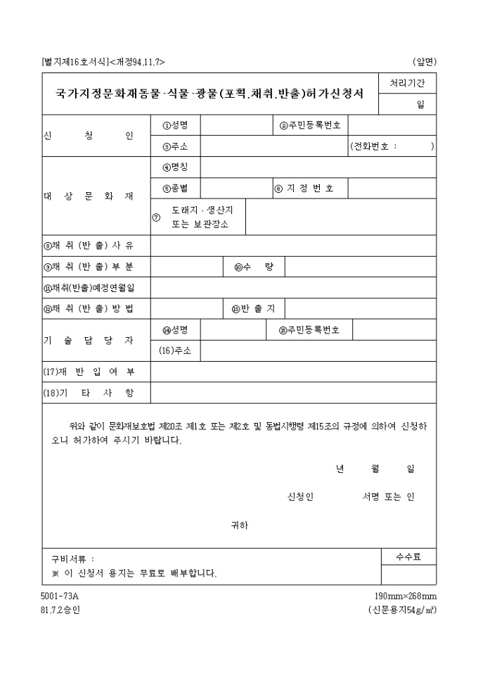9,000원/월위와 같이 문화재보호법 제20조 제1호 또는 제2호 및 동법시행령 제15조의 규정에 의하여 신청하오니 허가를 득하고자 할 때 사용하는 "국가 지정 문화재 동물·식물·광물(포획,채취,반출) 허가신청서" 양식입니다.