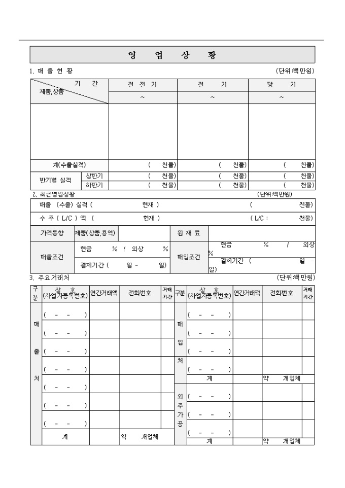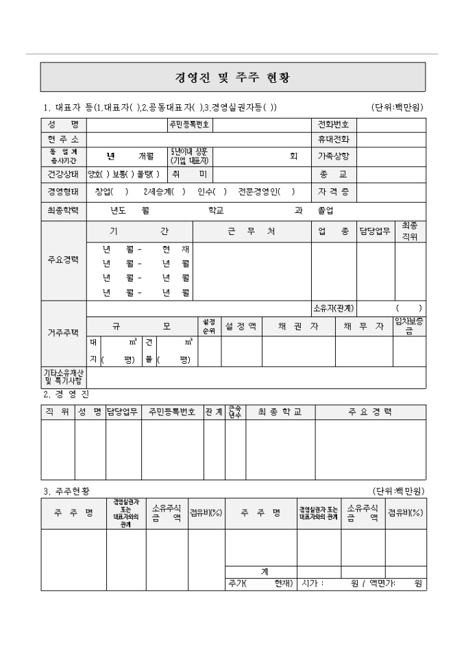 기업실태표(건설업이외)(기술신용보증기금) 양식입니다. 목차 1.기업체개황 2.경영진 및 주주현황 3.영업상황(건설업) 4.사업계획(건설업)