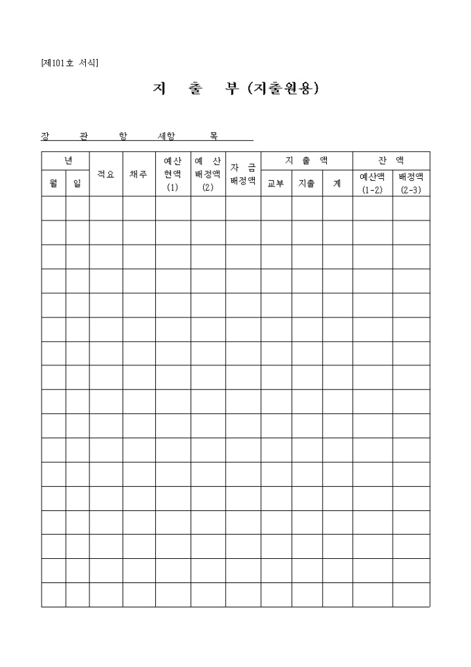 제101호 서식인 지출부(지출원용)로 적요,채주,예산현액,예산배정액,자금 배정액,지출액,잔액을 기록합니다.