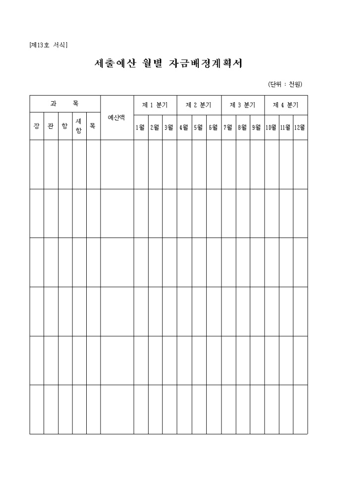 제13호 서식인 세출예산월별자금배정계획서로 과목별 예산액을 분기별로 기록하는 양식입니다.