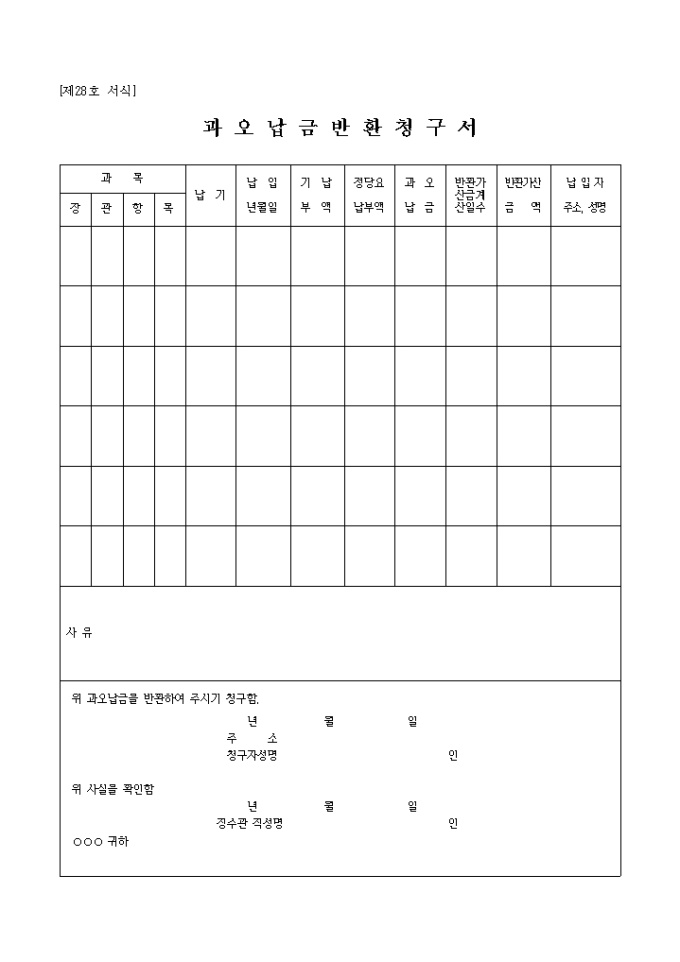 9,000원/월제28호 서식인 과오납금반환청구서로 과목별 납기,납일년월일,기압부액,정당요 납부액,과오납금,봔한가산금 계산일수,반환가산 금액,납입자의 주소,성명을 기입해야 합니다.