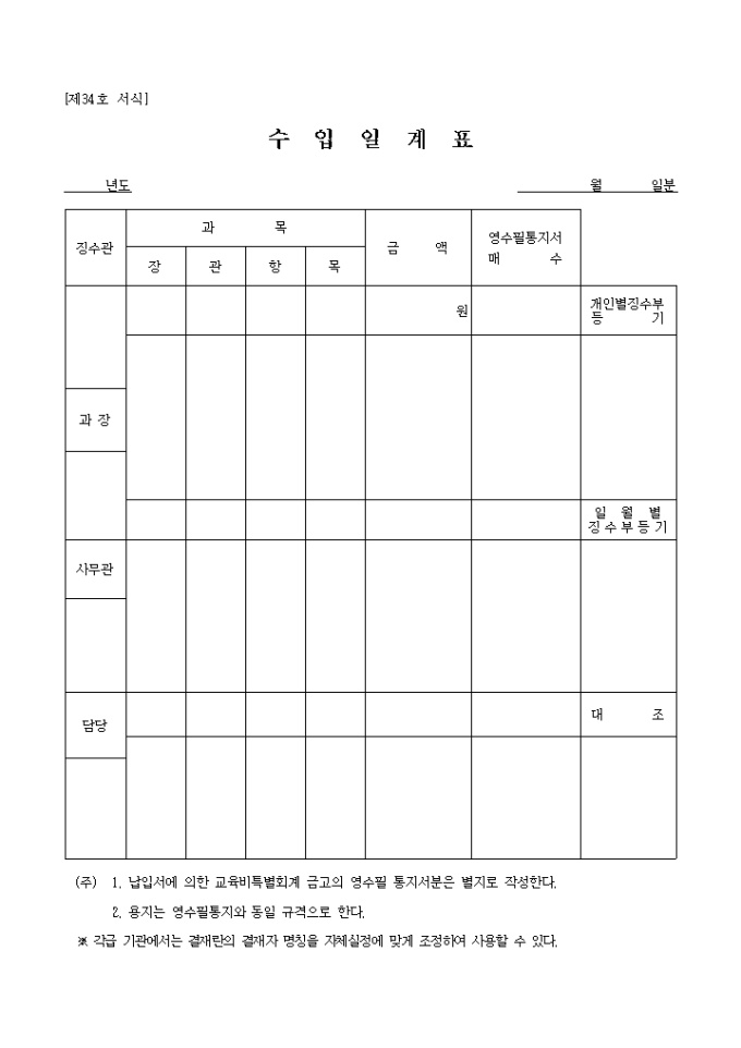 9,000원/월제34호 서식인 수입일계표로 과목별 금액,영수필통지서 매수를 기록합니다.