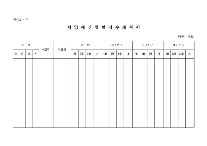 9,000원/월제42호 서식인 세입예산월별징수계획서로 분기별 예산액,재원별을 기록하는 양식입니다.