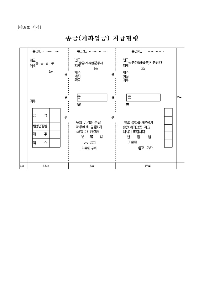 제56호 서식인 송금(계좌입금)지급명령서로 송금원부,송금(계좌입금)통지,송금(계좌입금)지급명령으로 구분되어 있습니다.