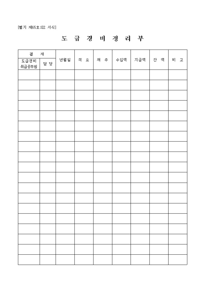 9,000원/월제65호의 2서식인 도급경비정리부으로 년월일,적요,채주,수입액,지급액,잔액을 기록하는 양식입니다.