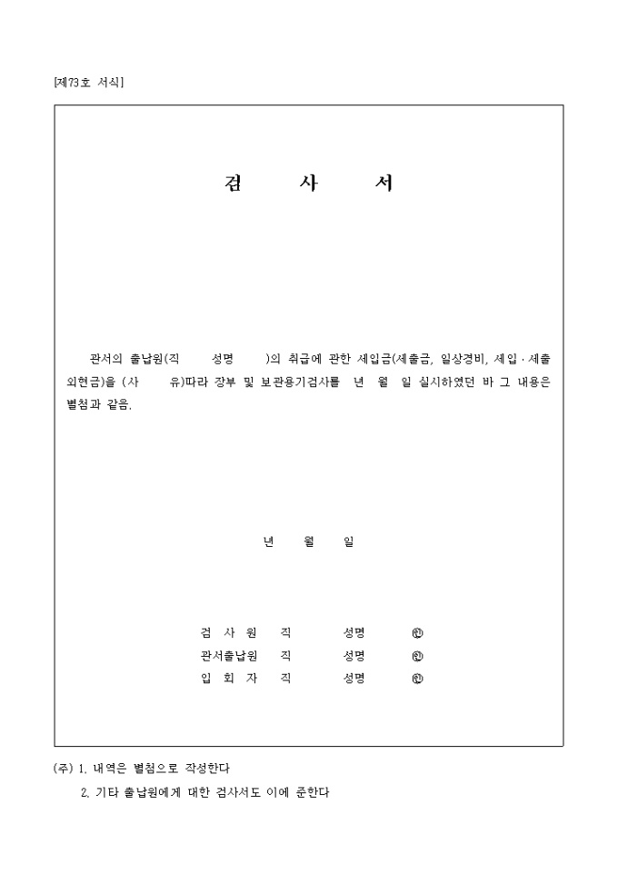 제73호 서식 검사서로 관서의 출납원(직 성명)의 취급에 관한 세입금(세출금, 일상경비, 세입․세출외현금)을 (사유)따라 장부 및 보관용기검사를 년 월 일 실시하였던 바 그 내용은 별첨과 같다는 내용입니다.