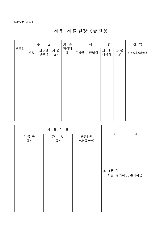 9,000원/월제76호 서식인 세입세출원장으로 수입,자금배정액,세출,잔액,자금운용으로 구성되어 있는 양식입니다