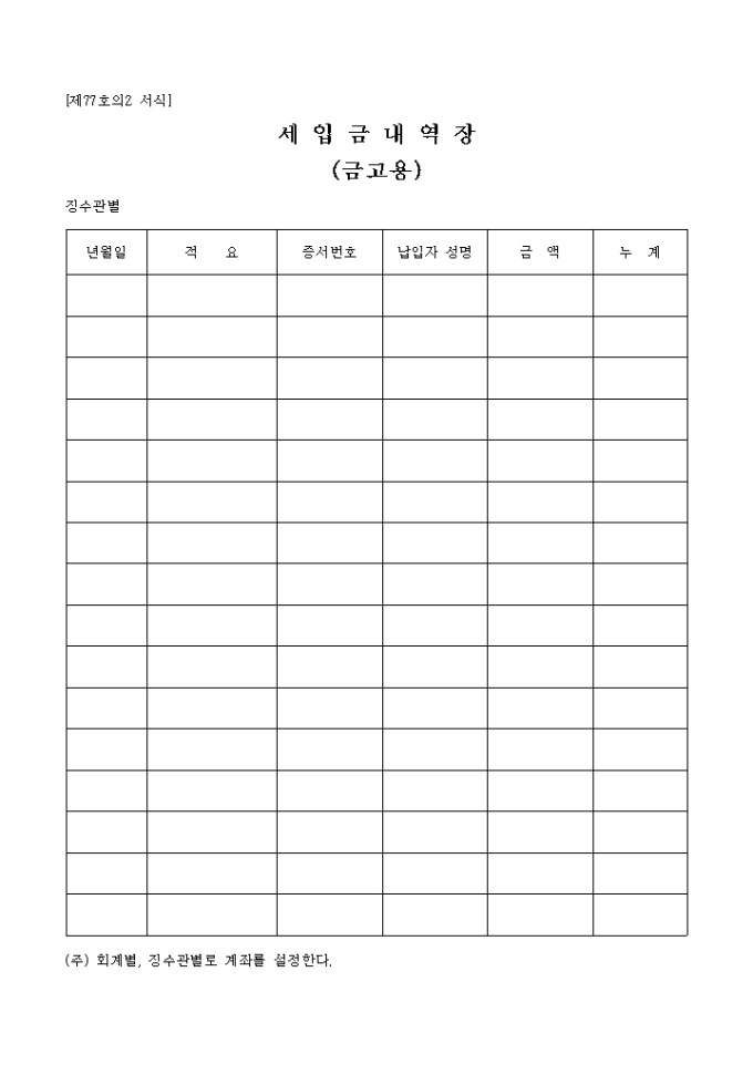 제77호의2서식인 세출금내역장으로 년월일,적요,증서번호,납입자 성명,금액,누계를 기록하는 양식입니다.