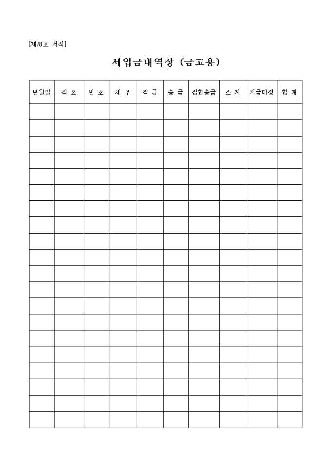제78호 서식인 세출금내역장(금고용)으로 적요,번호,채주,직급,송금,집합송금,소계,자금배정을 기록하는 양식입니다.