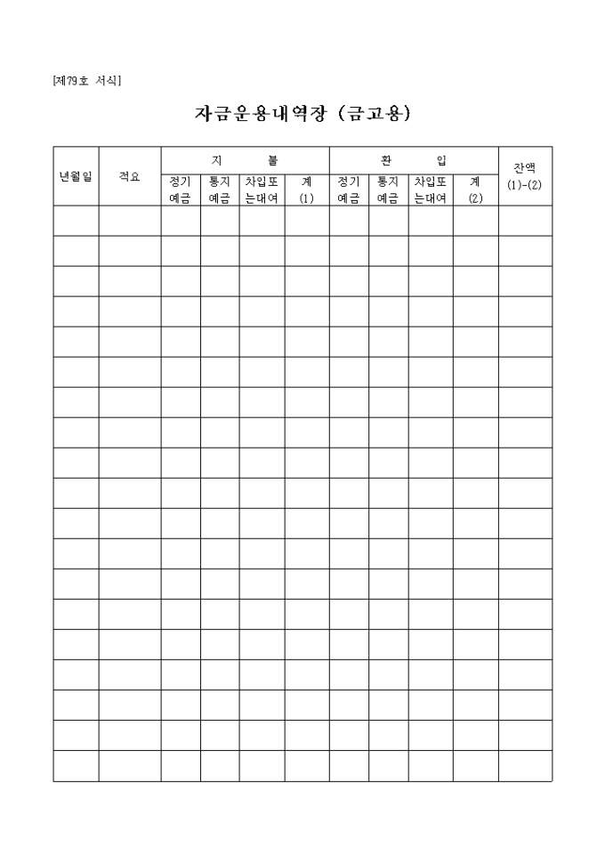 제79호 서식인자금운용내역장(금고용)으로 적요,지불,환입,잔액을 기록하는 양식입니다.
