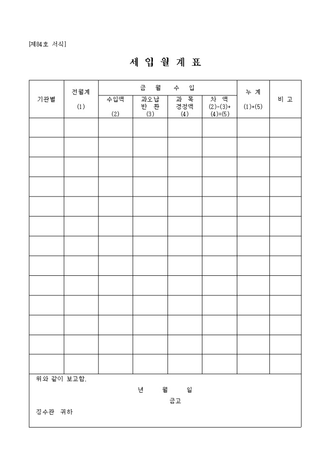 제84호 서식인 세입월계표로 기관별 전월계,금월수입내역,누계를 기록하는 양식입니다.
