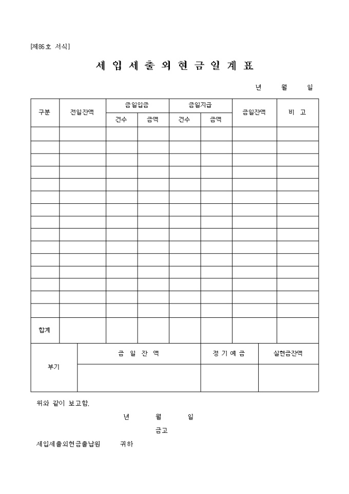 제86호 서식인 세입세출외현금일계표로 구분,전일잔액,금일입금,금일지급,금일잔액을 기록하는 양식입니다.