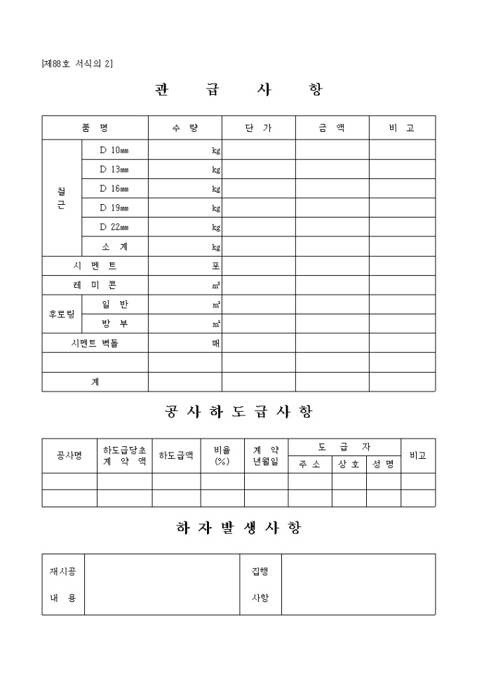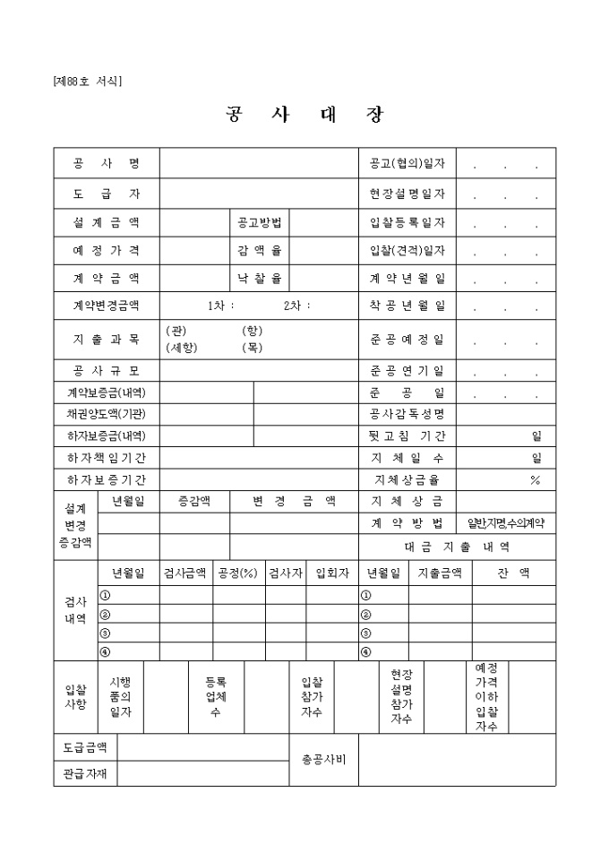 9,000원/월제88호 서식인 공사대장으로 공사명,도급자,설계금액,예정가격,계약금액,지출과목,공사규모,설계변경 증감액,검사내역 등을 기록하는 양식입니다.