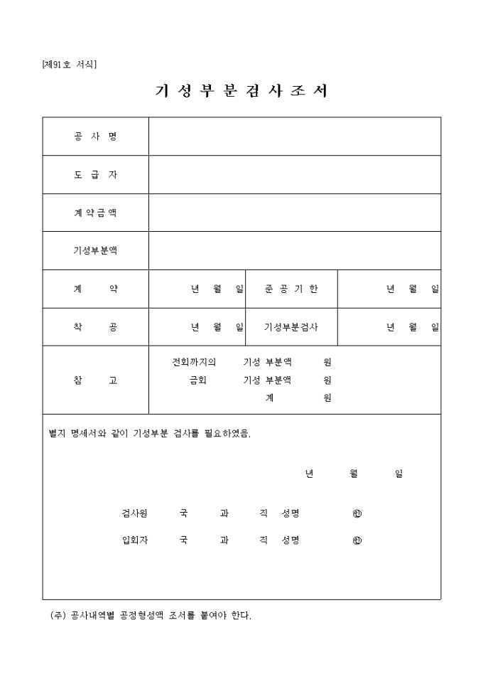 9,000원/월제91호 서식인 기성부분검사조서로 공사명,도급자,계약금액,기성부분액,계약일,착공일을 기록하는 양식입니다.
