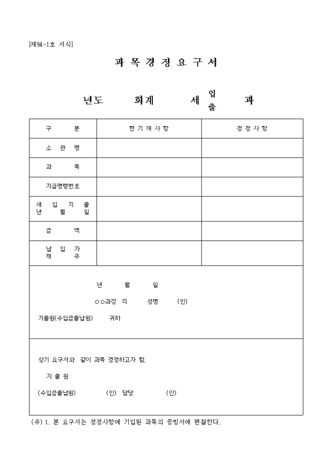9,000원/월제94호의1서식인 과목정정요구서로 소관명,과목,지급명령번호,세입지출년월일,금액,납입자를 현기재사항과 정정사항으로 기록하는 양식입니다.