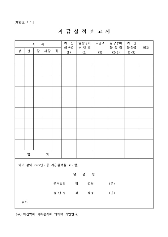 9,000원/월제98호 서식인 지급실적보고서로 과목별 예산배부액,일상경비 수령액,지급액,일상경비 불용액,예산 불용액을 기록하는 양식입니다.