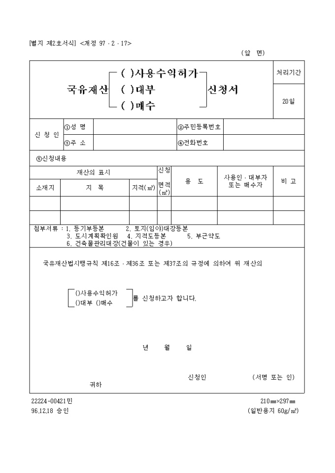 국유재산법시행규칙 제16조․제36조 또는 제37조의 규정에 의하여 위 재산의 ()사용수익허가,()대부, ()매수를 신청 하실때 사용하는 양식입니다.