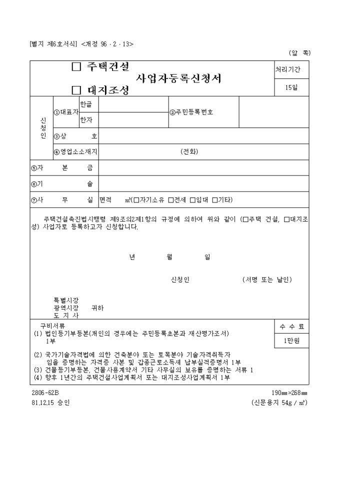 주택건설, 대지조성 사업자등록신청서