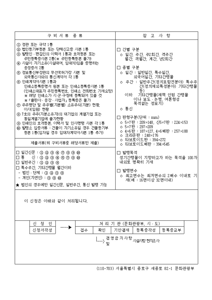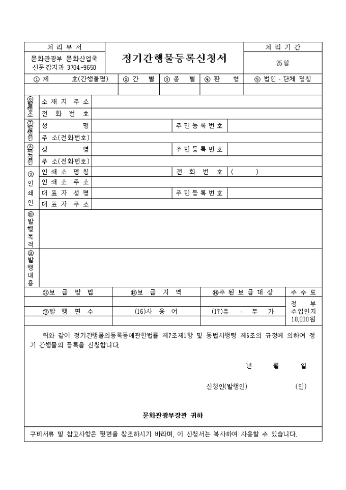위와 같이 정기간행물의등록등에 관한 법률 제7조제1항 및 동법시행령 제6조의 규정에 의하여 정기 간행물의 등록을 신청하고자 할 때 사용하는 정기 간행물 등록신청서 양식입니다.