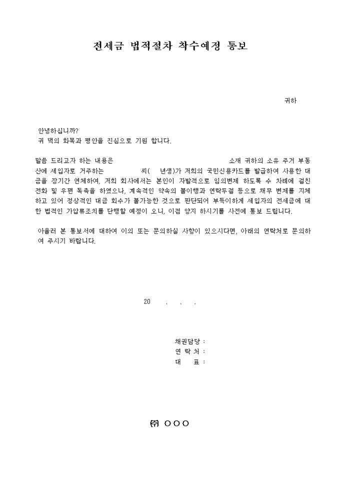 신용카드를 발급하여 사용한 대금을 장기간 연체하여 세입자의 전세금에 대한 법적인 가압류조치를 단행할 예정임을 통보하는 전세금 법적절차 착수예정 통보 양식입니다.