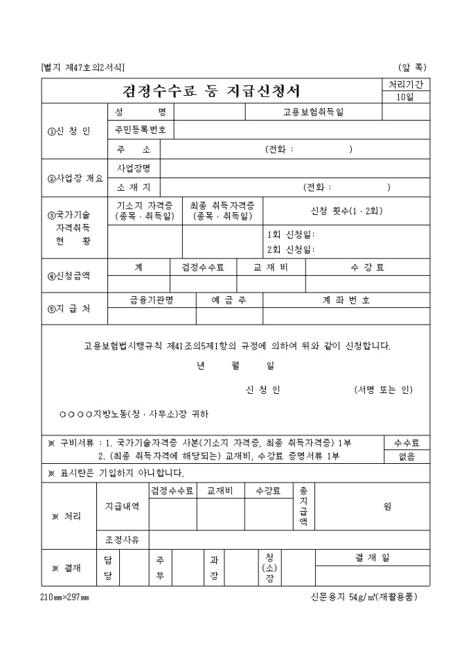 9,000원/월검정수수료등지급신청서[제47호의2서식] 양식입니다. 고용보험법시행규칙 제41조의5제1항의 규정에 의하여 위와 같이 신청하실때 사용하는 양식입니다. 구비서류 1. 국가기술자격증 사본(기소지 자격증, 최종 취득자격증) 1부 2. (최종 취득자격에 해당되는) 교재비, 수강료 증명서류 1부