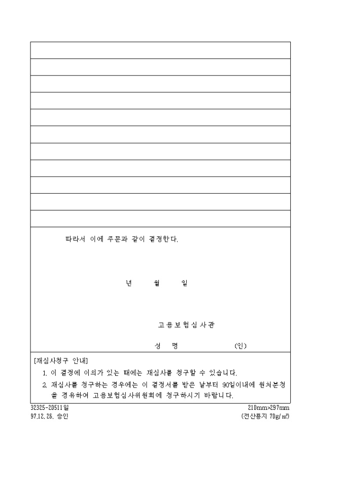 결정서[제105호서식] 양식입니다. [재심사청구 안내] 1. 이 결정에 이의가 있는 때에는 재심사를 청구할 수 있습니다. 2. 재심사를 청구하는 경우에는 이 결정서를 받은 날부터 90일이내에 원처분청을 경유하여 고용보험심사위원회에 청구하시기 바랍니다.