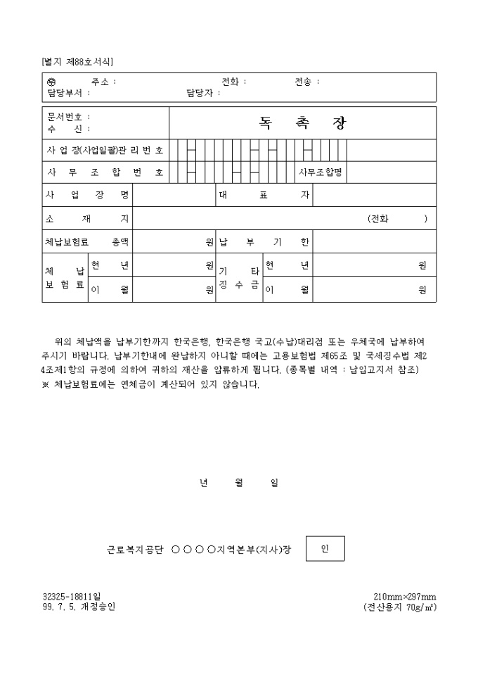 고용독촉장[제88호서식] 양식입니다. 위의 체납액을 납부기한까지 한국은행, 한국은행 국고(수납)대리점 또는 우체국에 납부하여 주시기 바랍니다. 납부기한내에 완납하지 아니할 때에는 고용보험법 제65조 및 국세징수법 제24조제1항의 규정에 의하여 귀하의 재산을 압류하게 됩니다. (종목별 내역 : 납입고지서 참조) ※ 체납보험료에는 연체금이 계산되어 있지 않습니다. ...