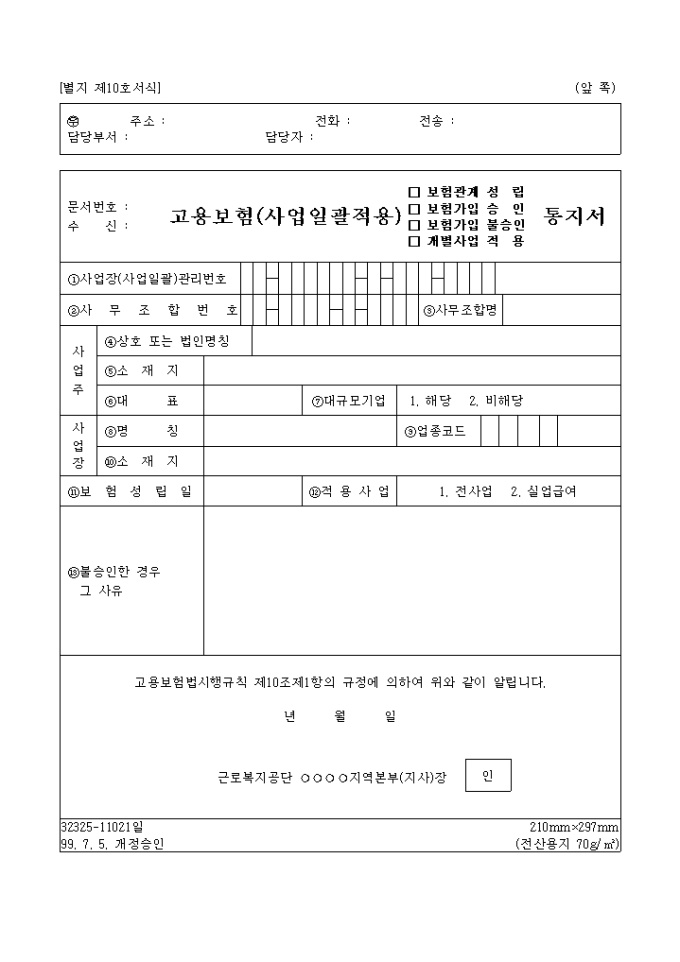 고용보험법시행규칙 제10조제1항의 규정에 의하여고용보험 가입관련내용을 통지를 할 때 사용하는 양식입니다.