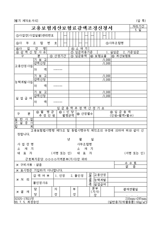 고용보험법시행령 제73조 및 동법시행규칙 제72조의 규정에 의하여 고용보험 개산보험료 감액을 조정 신청할 때 사용하는 양식입니다.