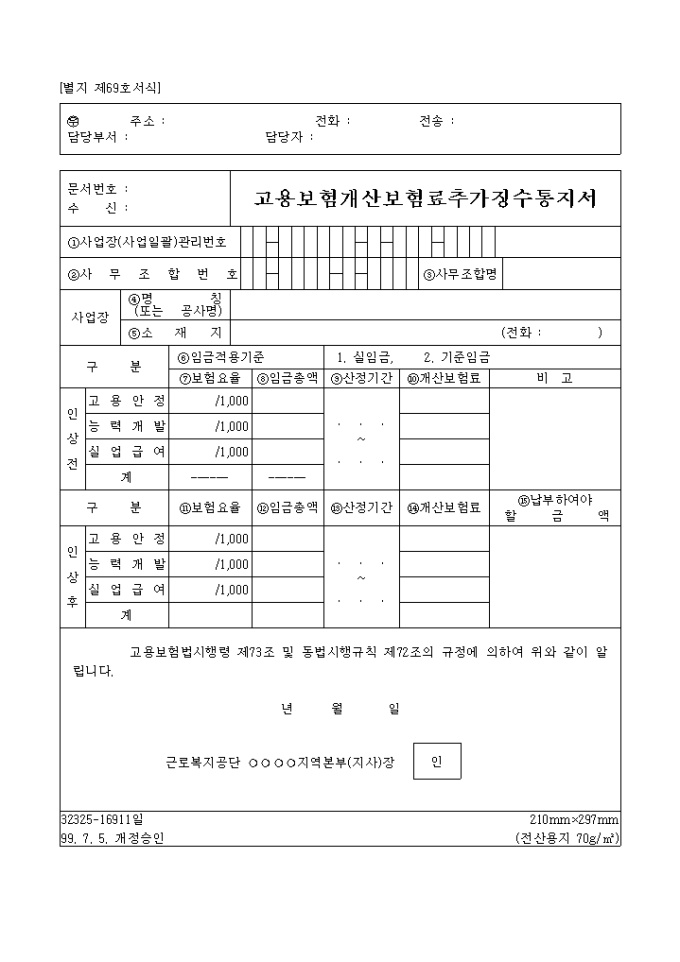 [별지 제69호서식] 고용보험법시행령 제73조 및 동법시행규칙 제72조의 규정에 의하여 고용보험 개산 보험료의 추가 징수를 통지할 때 사용하는 양식입니다.