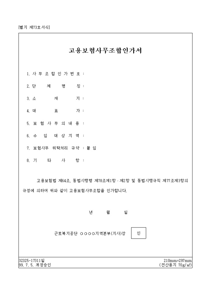 고용보험법 제64조, 동법시행령 제78조제1항․제2항 및 동법시행규칙 제77조제3항의 규정에 의하여 위와 같이 고용보험사무조합을 인가할 때 사용하는 양식입니다.