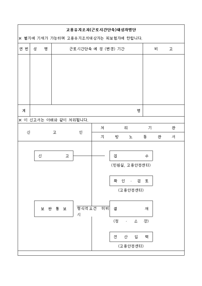 고용유지조치(근로시간단축)계획(계획변경)신고서[제25호의2서식] 양식입니다. 고용보험법시행령 제17조의2제2항 및 동법시행규칙 제22조의3의 규정에 의하여 위와 같이 신고하실때 사용하는 양식입니다.