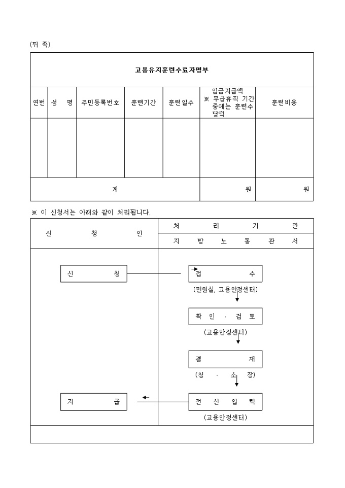 고용보험법시행령 제17조제1항제3호 및 동법시행규칙 제21조의 규정에 의하여고용유지지원금의 비용정산보고와 지원을 신청할 때 사용하는 양식입니다.고용유지훈련수료자명부도 첨부되어 있습니다.
