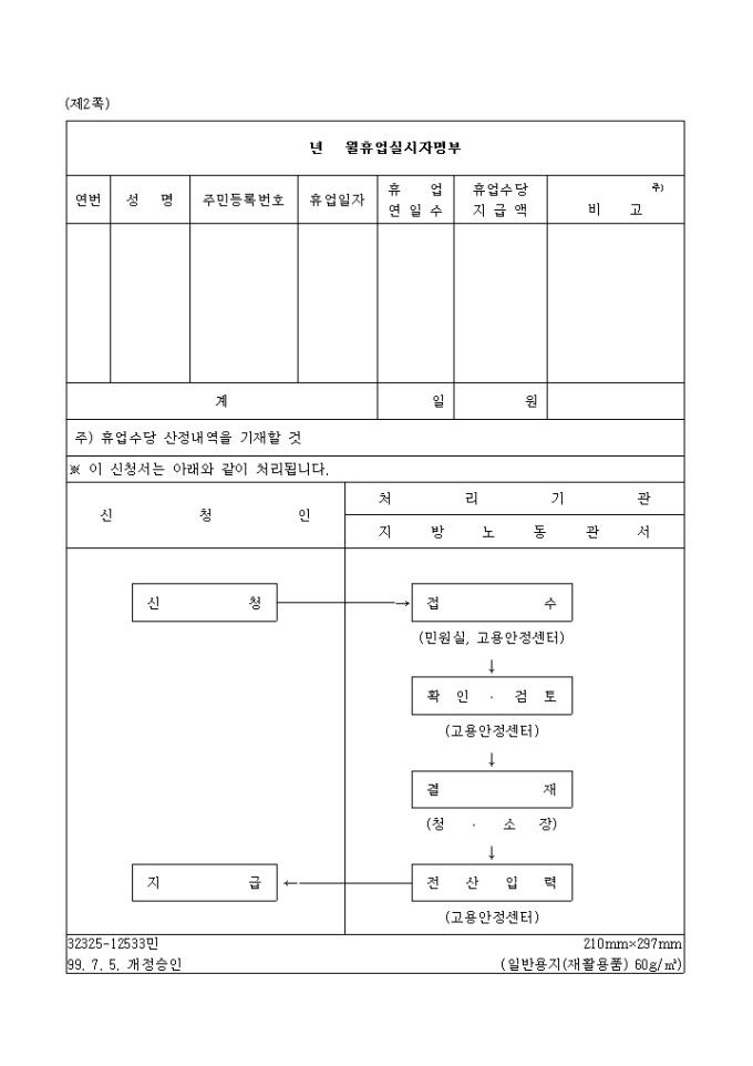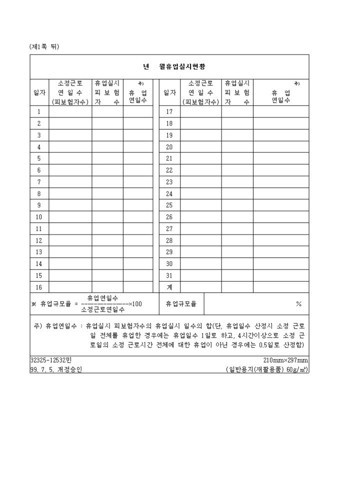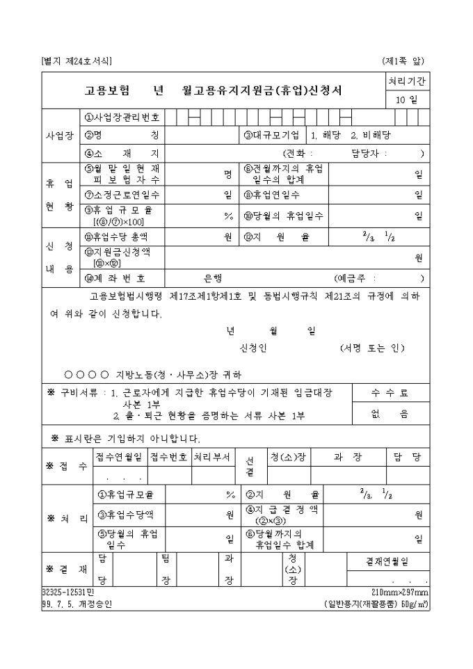 9,000원/월고용유지지원금(휴업)신청서[제24호서식] 양식입니다. 고용보험법시행령 제17조제1항제1호 및 동법시행규칙 제21조의 규정에 의하여 위와 같이 신청하실때 사용하시는 양식입니다. 구비서류 1. 근로자에게 지급한 휴업수당이 기재된 임금대장 사본 1부 2. 출 퇴근 현황을 증명하는 서류 사본 1부