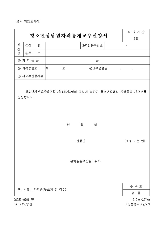 청소년기본법시행규칙 제14조제2항의 규정에 의하여 청소년상담원 자격증의 재교부를 신청하고자 할 때 사용하는 청소년 상담원 자격증 재교부신청서 양식입니다