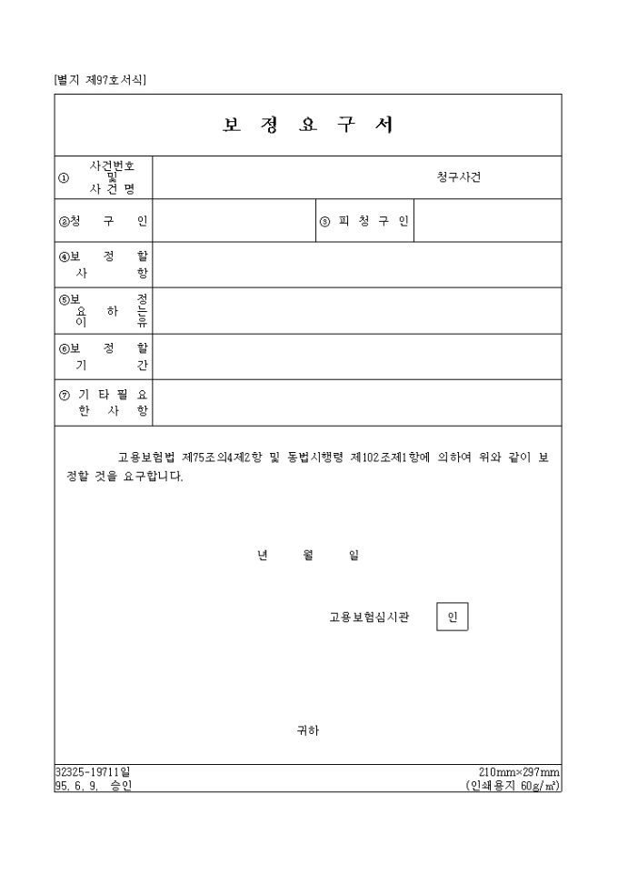 9,000원/월[별지 제97호서식] 고용보험법 제75조의4제2항 및 동법시행령 제102조제1항에 의하여 보정을 요구할 때 사용하는 양식입니다.